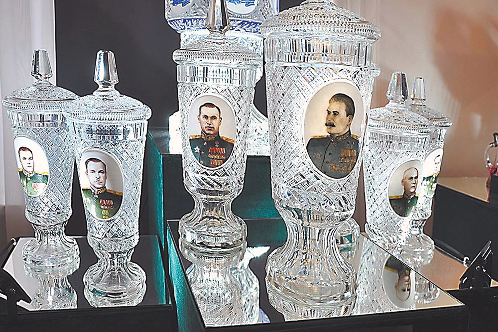 После Октябрьской революции все эти предприятия были национализированы. Часть из них перепрофилировали под выпуск промышленного стекла, но и художественные изделия никуда не делись. Значительная часть из них соответствовала духу времени. Чернильницы в форме будёновок, украшенные звёздами пивные кружки, пресс-папье, салатники, вазы и пепельницы не только продавались в магазинах, но и вручались в качестве наград героям эпохи исторического материализма. Но борьба с мещанством давала о себе знать, и комсомольцы предпочитали более простую посуду. Тем не менее на банкетах высшего уровня на стол ставили именно хрусталь. Так, в конце 1930-х годов знаменитая Вера Мухина создала сервиз для правительственных приёмов, получивший название «Кремлёвский». Первый экземпляр был подарен рабочими завода «Красный гигант» Сталину на его 60-летие в 1939 году.