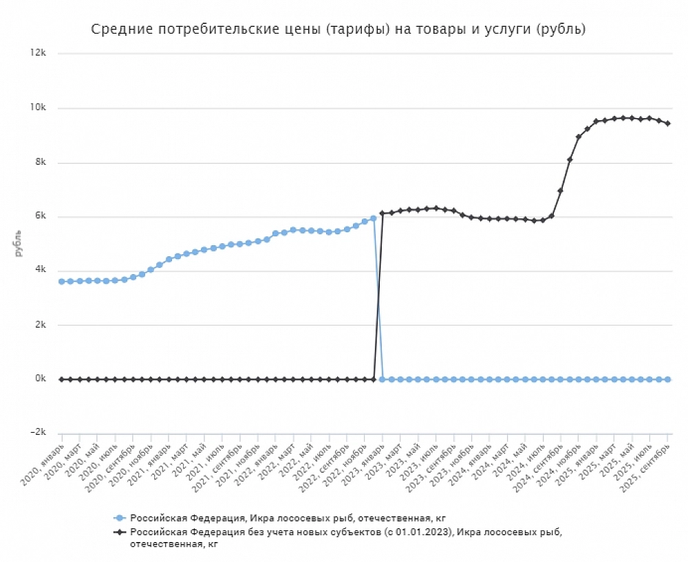Как посчитали в Росстате, в сентябре 2024 года килограмм лососевой икры стоил 6,9 тыс. руб., а в сентябре 2025 года — уже 9,4 тыс. руб., цены выросли более чем на 35%. Схожие данные приводят аналитики сервиса «Контур.Маркет», там зафиксировали рост в 33%.