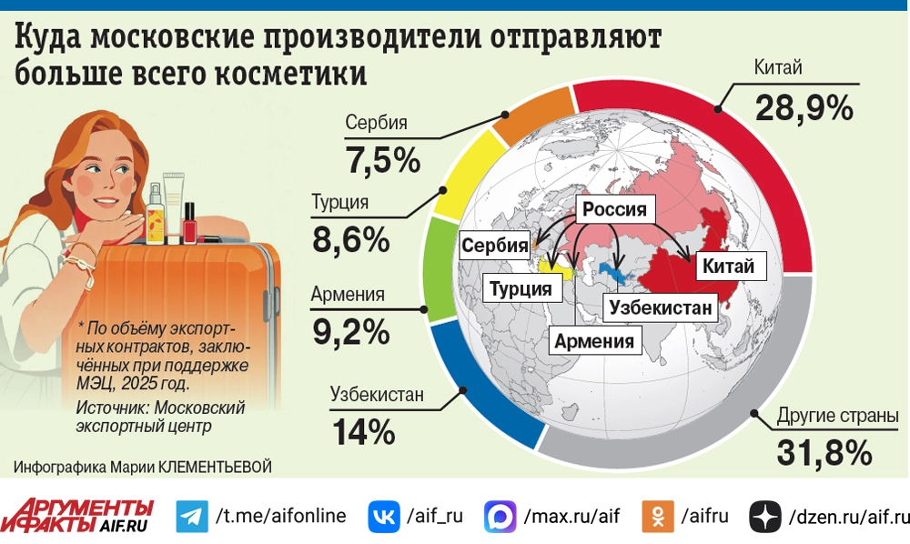 «В основном московские производители отправляют за рубеж повседневную косметику, её объем составляет порядка 85%, – рассказали в Московском экспортном центре. – Ещё 13% приходятся на долю детской косметики. В прошлом году общий объём контрактов, заключённых при поддержке МЭЦ в косметической отрасли, составил 2,2 миллиарда рублей, и такого результата удалось достичь благодаря комплексной работе со столичными компаниями и партнёрами за рубежом. Например, наш амбассадор в Китае помог столичной компании заключить контракт на поставку косметики на сумму более 176 миллионов рублей, а другая московская компания заняла своё место в ретейл-сетях Узбекистана, подписав соглашение на 80,5 миллиона рублей. И эту динамику важно поддерживать. В этом году столичные производители, используя городские инструменты поддержки, могут заявить о себе в ходе выставок и бизнес-миссий в Таиланде, Турции, Вьетнаме, Китае и Мексике».