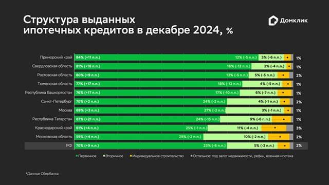 Доля первичного жилья в общем объеме ипотечных выдач в декабре выросла сразу на 9 п.п. до рекордного уровня — 70%. В январе 2025 года доля сегмента продолжает оставаться на рекордно высоком уровне и составила около 71%.