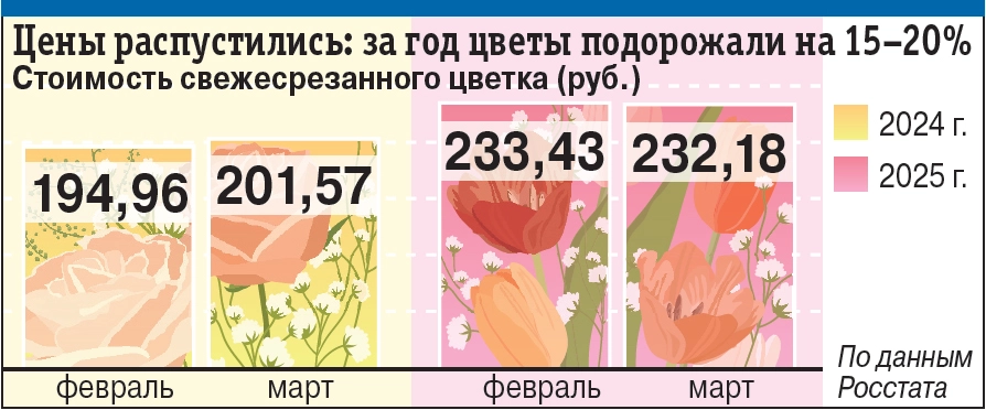 Рост цен на цветы к Международному женскому дню в рознице может составить от 10 до 20%, прогнозируют в Национальной ассоциации цветоводов.