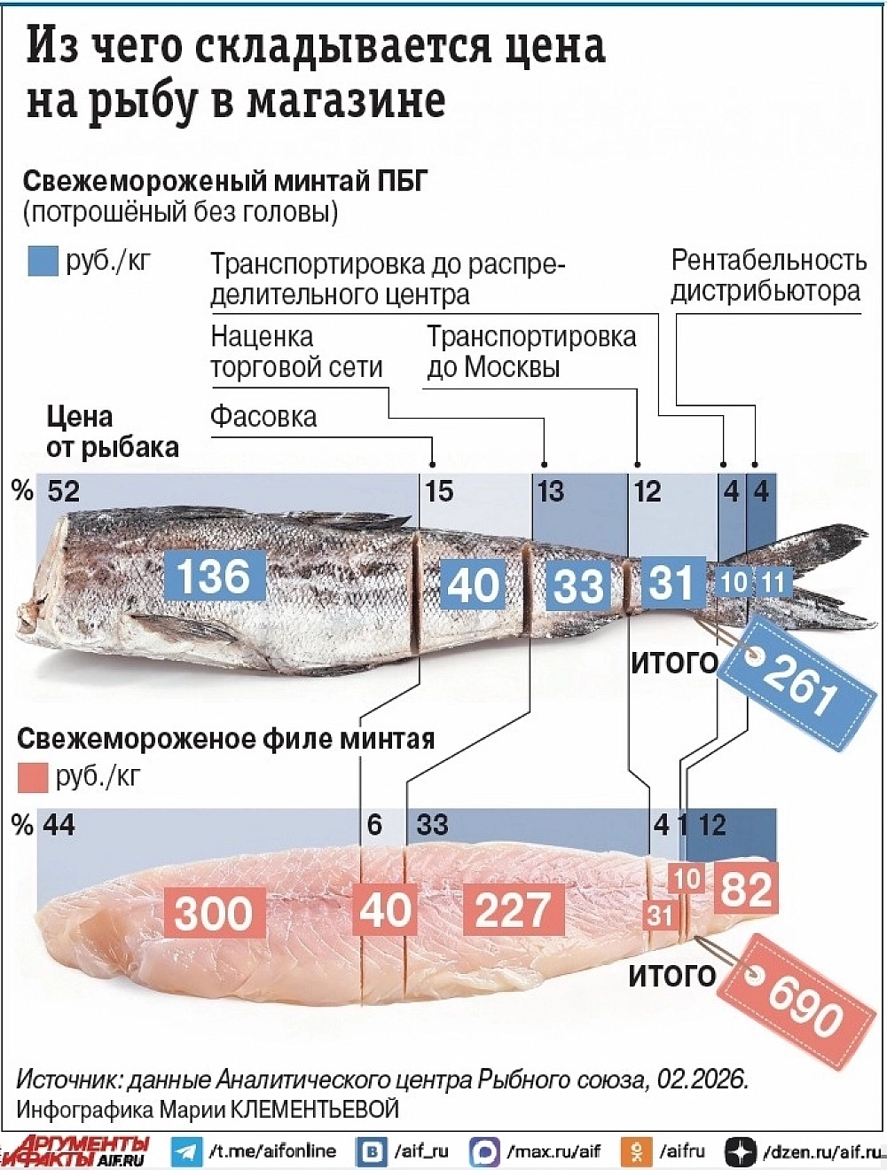 В России между тем всё чаще выбирают более «бюджетную» рыбу. Подорожавшую треску заменяют минтаем или крабовыми палочками, говорят в Рыбном союзе. «Некоторые производители даже начали работать с ресторанами быстрого питания, которые выпускают бургеры с рыбными котлетами, — отмечает Горячев. — В целом же на ценник в магазине влияют и логистика, и фасовка, и наценка торговой сети, и сезон. Взять хотя бы мойву: на прилавках сейчас дальневосточная рыба, вылов которой слабый, а издержки высокие, отсюда и кусачая цена».