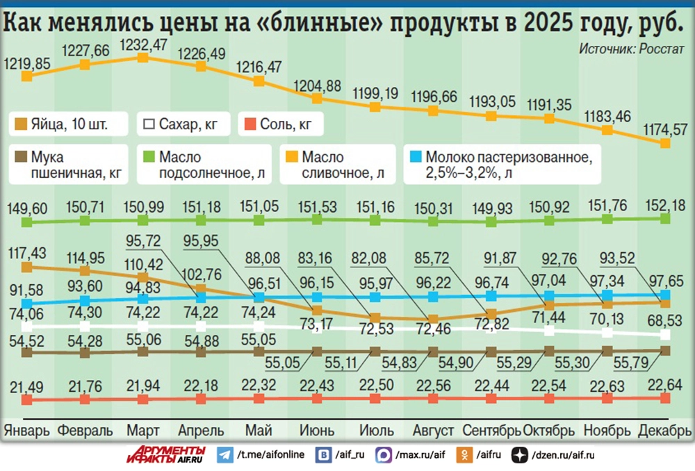 Как выяснилось, в 2025 году в «блинном» наборе подешевели сливочное масло (цена за 1 килограмм с 1219,85 рубля снизилась до 1174,57 рубля), сахар (с 74,06 до 68,53 рубля за 1 килограмм) и яйца (десяток в январе 2025 года стоил 117,43 рубля, а в декабре — уже 93,52 рубля). Остальные продукты незначительно подорожали, прибавив в цене от 1 до 6 рублей. Таким образом, 10 блинчиков в декабре 2024 года обошлись бы хозяйке в 78,41 рубля, а в декабре 2025-го — уже в 76,24 рубля. Снижение — на 1,63% при годовой инфляции 5,59%.