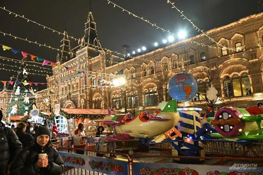 Следующая точка, конечно, площадь возле ГУМа. Тут уже вовсю работает открытый каток, попасть на который можно бесплатно по предварительной записи. А ещё здесь крутятся всевозможные аттракционы и работает ярмарка. Акцент сделан на Дымковскую игрушку.