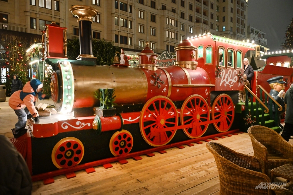 Локации «Зимы в Москве» на Площади Революции совершенно неожиданны — здесь расположился сияющий огнями паровозик. Зерда Максидалиева пришла сюда с сестренкой. Девочка в восторге бегает по вагончику, пока старшая сестра отвечает на вопросы.