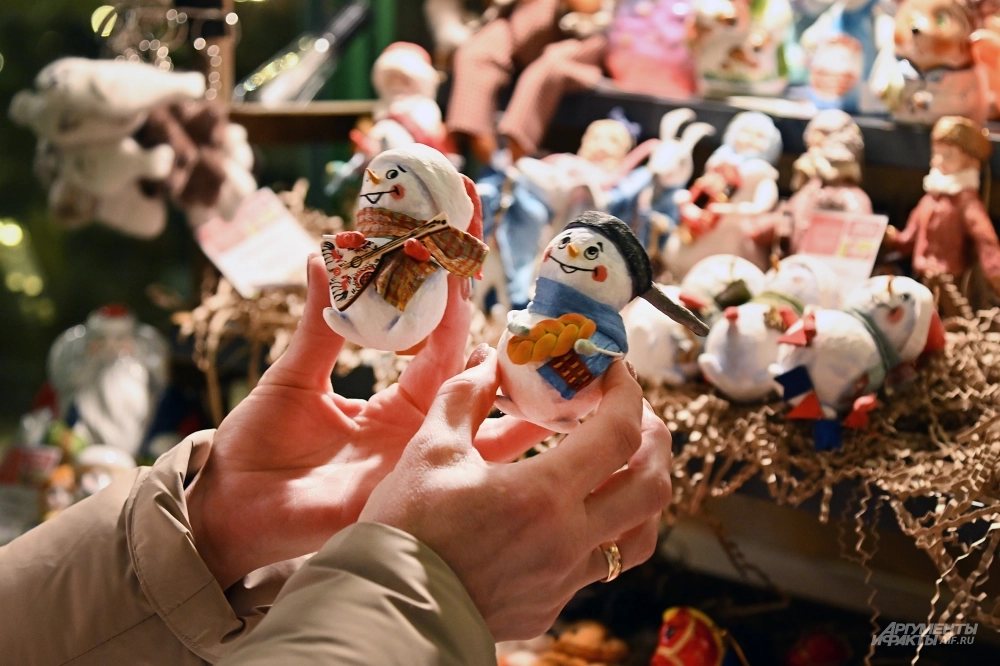 Ещё одна палатка ярмарки наполнена ватными игрушками. Неля Соловей, достающая для покупателей партию снеговичков, рассказывает о том, что больше всего интересует москвичей.