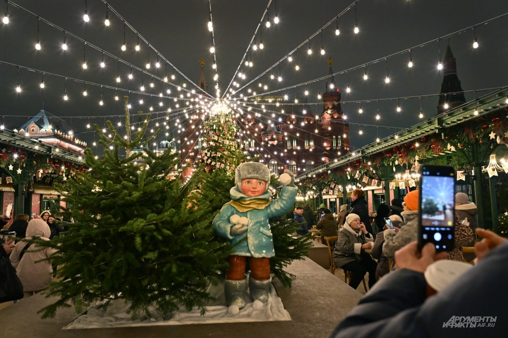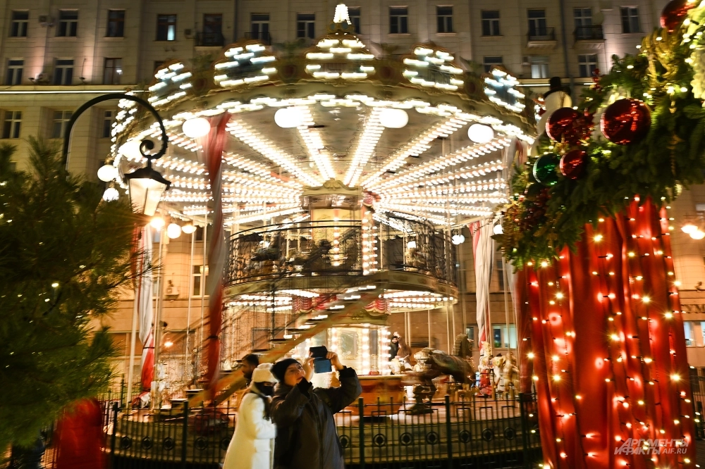 На Манежной площади — свой эксклюзив. Ростовые ретроигрушки, выстроенные вокруг елки. Тут детишки в костюмах зайчиков, снеговичков, в ярких варежках и пуховых платках, на санках и с питомцами. Чтобы внимательно рассмотреть каждую, конечно, потребуется время, но оно того стоит. Эмоции взрослых ничуть не уступают детским.
