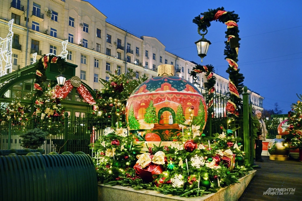 Начинаем с Тверской площади. Здесь расположена самая большая в Москве арка с огоньками. Площадку видно издалека. Прямо на входе огромные шары с ручной росписью. Тут и Дед Мороз, и соборы, и новогодние фонарики. Каждый приходящий непременно делает фото на память.