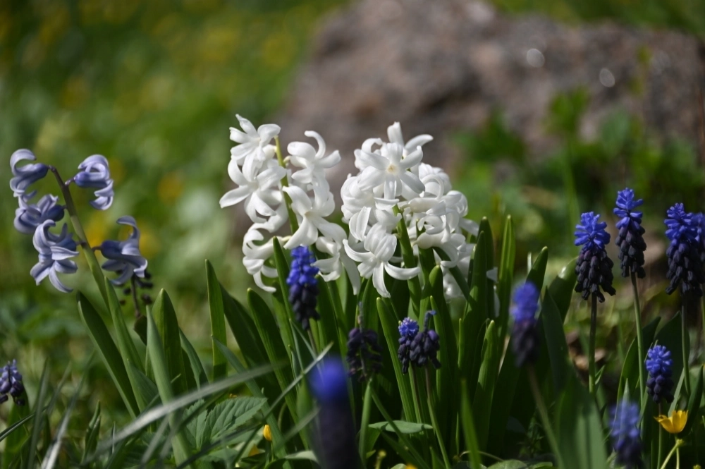 К ним постепенно присоединяются мускари — плотные соцветия насыщенного фиолетово-синего цвета с характерным медовым ароматом, а также нарциссы, которые добавляют яркие желтые и белые акценты в композиции.