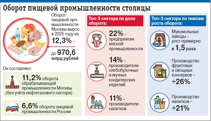13,3 млн москвичей ежегодно съедают примерно 13,1 млн тонн продуктов. Это больше, чем весят 87 тысяч синих китов, а чтобы перевезти такое количество еды разом, потребовалось бы 325 тысяч тягачей. Сейчас в городе работают более 350 предприятий пищепрома, на которых трудоустроены 65 тысяч человек. Больше всего кондитерских фабрик – более 110. На втором месте – производства хлебобулочных изделий (более 100), на третьем – мясоперерабатывающие комбинаты (более 40).