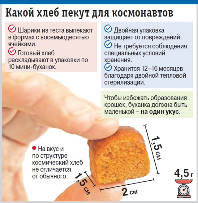 А ещё в Москве производят еду для космонавтов. Все знают, что это питательный гель, расфасованный в тюбики. Однако в орбитальный рацион входит ещё и хлеб, который пекут в столице (см. инфографику). Пекут маленькими кубиками, чтобы космонавт мог съесть порцию, не откусывая, а не то крошки в невесомости разлетятся по МКС и повредят оборудование. Делают для космического питания и бородинский хлеб, и пшеничный, и кексы, и рулетики. Хранится такой до полутора лет за счёт герметичной упаковки и стерильного производства.