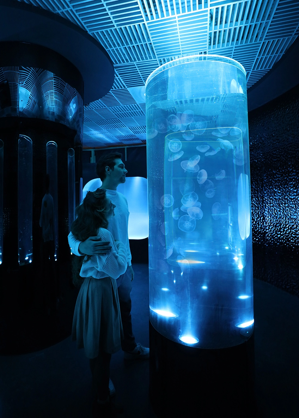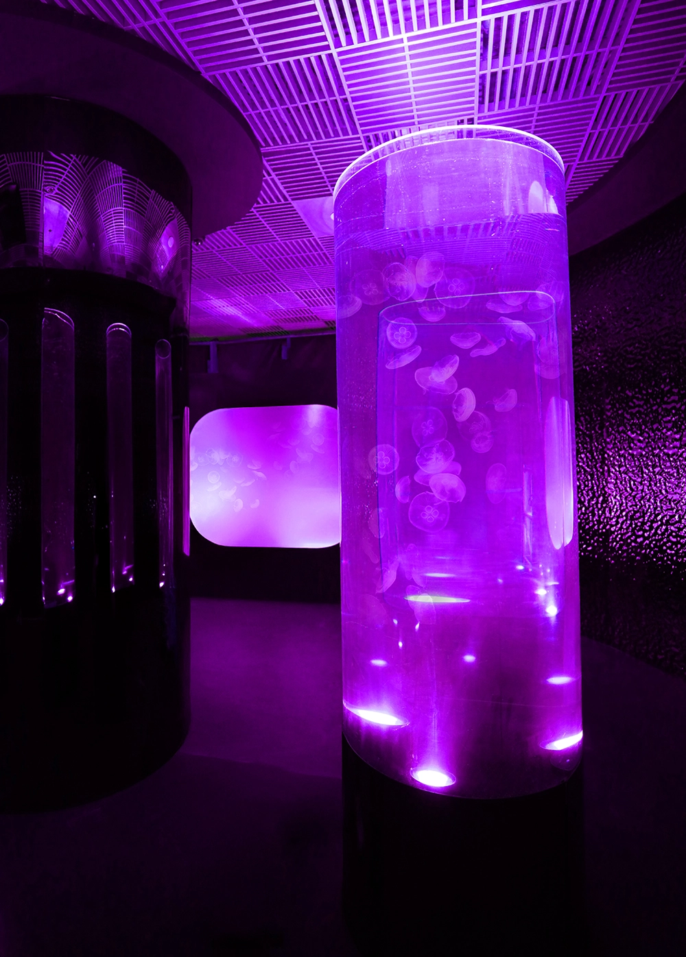Кажется, что ты очутился на инопланетном корабле из фантастических фильмов. В полумраке в больших стеклянных колбах-аквариумах медленно плавают порядка 200 медуз. От подсветки их желейные тела меняют цвет. То они розовые, то голубые, то желтые или зелёные — эта магия света по-настоящему завораживает.