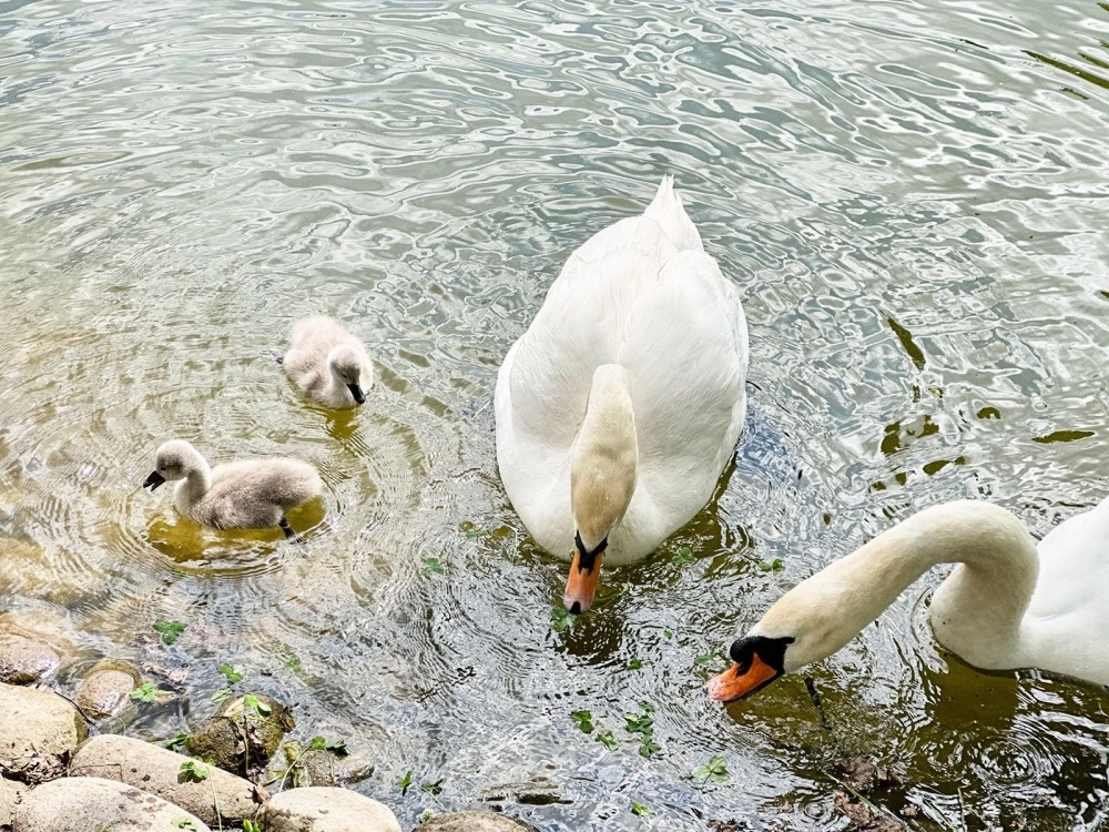 Летом лебеди добывают пищу самостоятельно — они умеют находить осоку, водоросли и мелких ракообразных. Несмотря на то, что птицы кажутся приветливыми, они не слишком любят близкое внимание — чаще отплывают в тихие уголки прудов, где чувствуют себя спокойнее.
