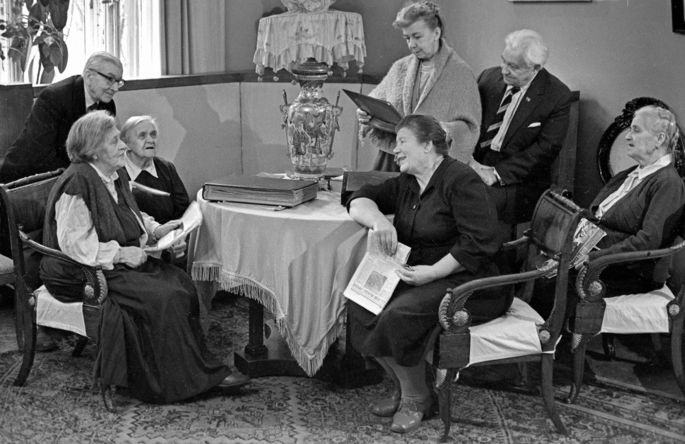 Прежде чем побеседовать с нашими героями, мы прогулялись по Дому. Второй этаж открывается холлом с мягкими креслами и телевизором. «Декорируют» и добавляют театральности большой гостиной тумба с афишами, а у витринных окон — манекены в театральных костюмах. Периодически их наряды меняются благодаря творческой руке бывшего театрального художника Любови Лаптевой. По коридору налево — зимний сад с полуметровыми растениями и дачными плетеными креслами. Тут жильцы Дома могут уединиться — кто-то приходит сюда с книгой, кто-то — с вязанием. Много в Доме ветеранов сделано для того, чтобы пожилые москвичи чувствовали себя как дома — и даже лучше.
