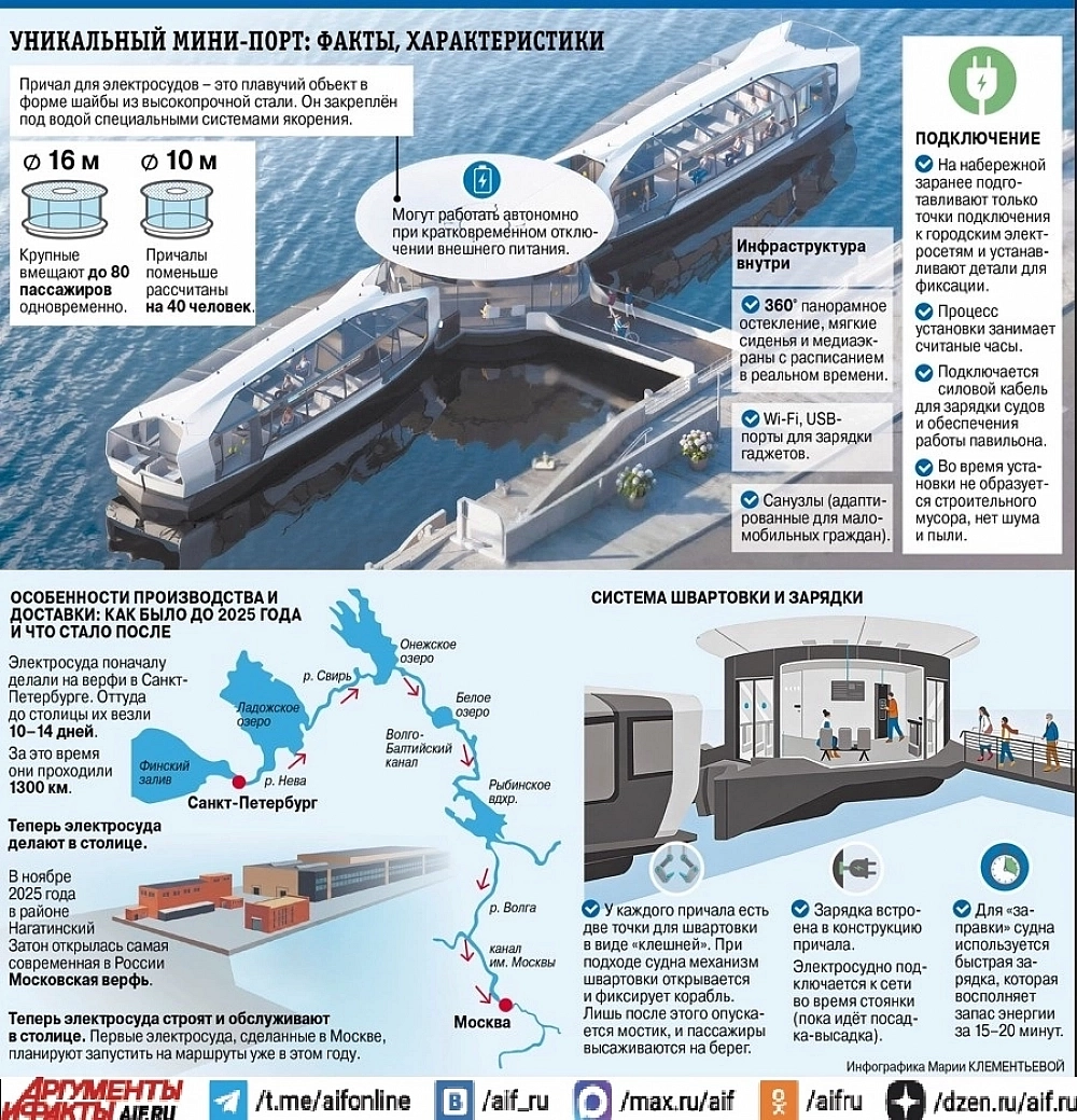 В Москве, например, сезон речной навигации открылся 24 апреля. Хотя, строго говоря, здесь она в последние 3 года окончательно и не закрывается. Только частично. С тех пор, как летом ­2023-го в столице появился регулярный речной транспорт, по Москве-реке круглый год с 7.00 до 23.00, без перерывов на выходные, по трём маршрутам курсируют электросуда. Своего рода электробусы на воде: многие москвичи в своих ежедневных поездках на работу и учёбу сменили наземный транспорт на речной. Это быстро, недорого, комфортно и... романтично. Привлекательно всё: от интерьера электросудов до специальных плавучих причалов. Последних на сегодняшний день в Москве уже 24.