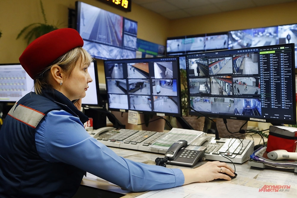 Дежурная Елена Аникина встречает меня в служебном помещении, где десятки мониторов показывают каждый участок платформы и вестибюля. «Мы работаем по 12 часов: день, ночь, потом отсыпаемся и отдыхаем», – рассказывает она, принимая смену.