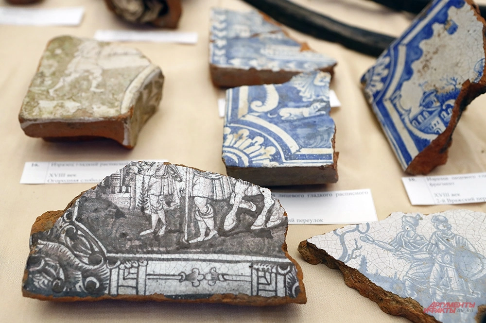 «Печь в доме – это не только источник тепла, но и источник обучения, – подчеркнул Алексей Емельянов. – Ведь археологам предстоит расшифровать фразу на одном из найденных фрагментов печки». Эти «кусочки» XVI–XVII веков пополнят коллекции московских музеев. Самый поздний фрагмент выполнен в голландской технике обработки изразцов, привезённой Петром I. Фото: АиФ/ Игорь Харитонов