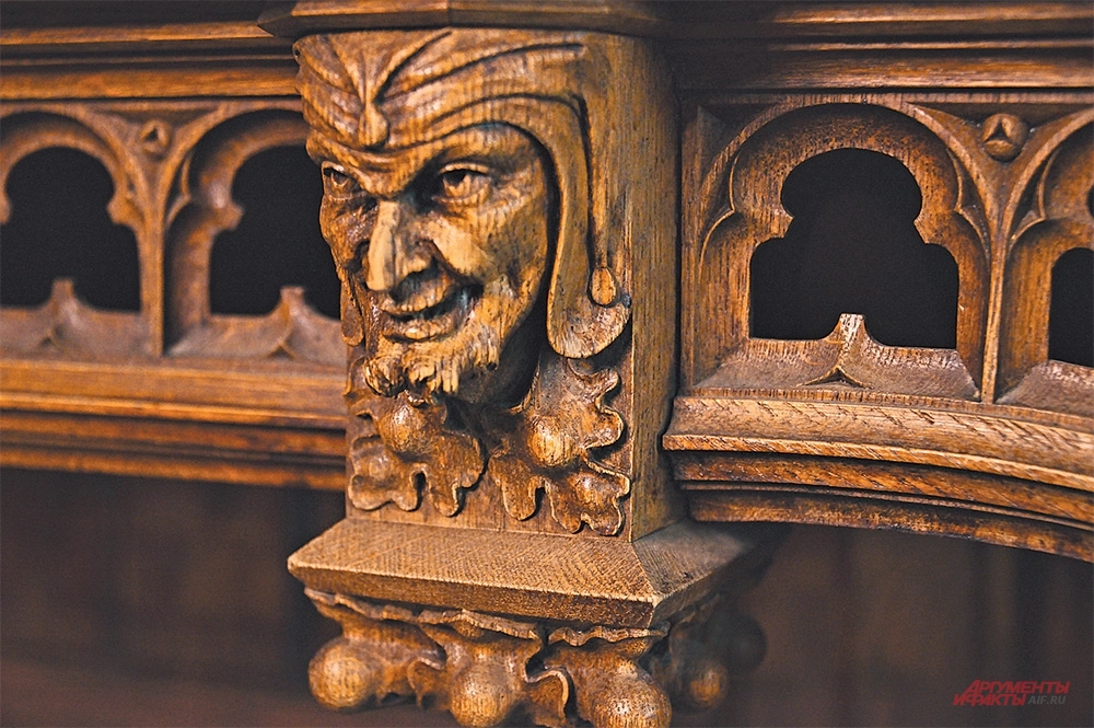 Здесь в одном помещении готика, в другом – барокко, в третьем – рококо. Тут можно полюбоваться на игру света от витражных окон; увидеть гаргулий на мебели и лестницу из искусственного мрамора, не уступавшего в то время по цене натуральному; сложные рисунки укладки паркета, в которых читаются изображения грифонов; фальшзеркала, за которыми скрываются двери; мраморных атлантов вместо ножек столов…
