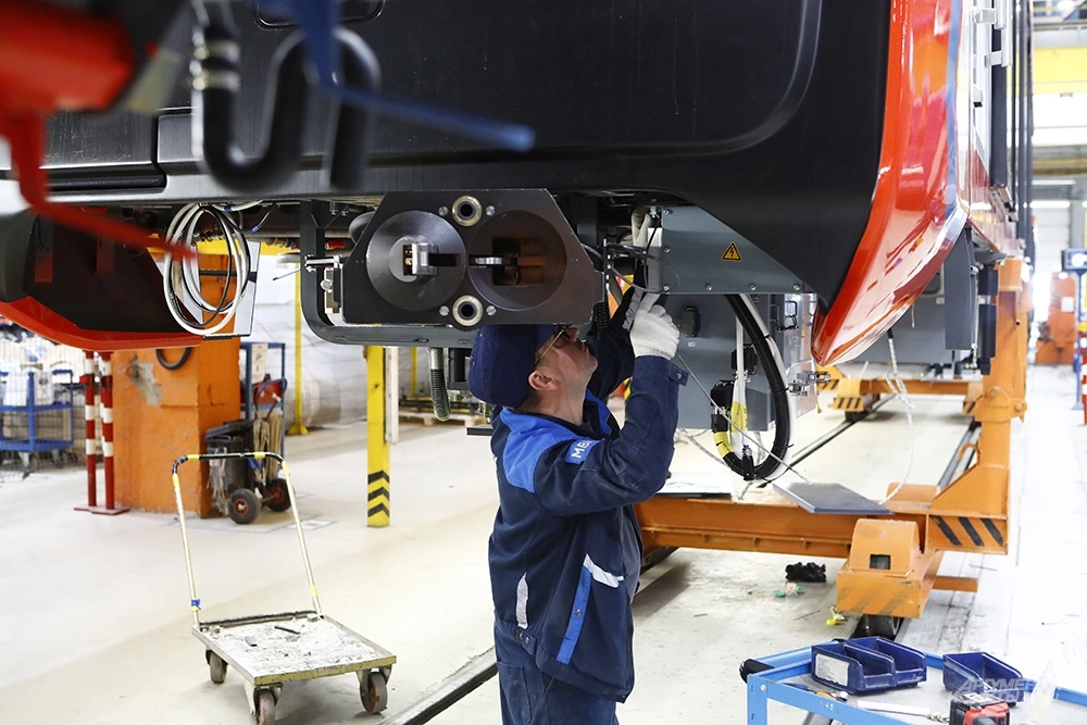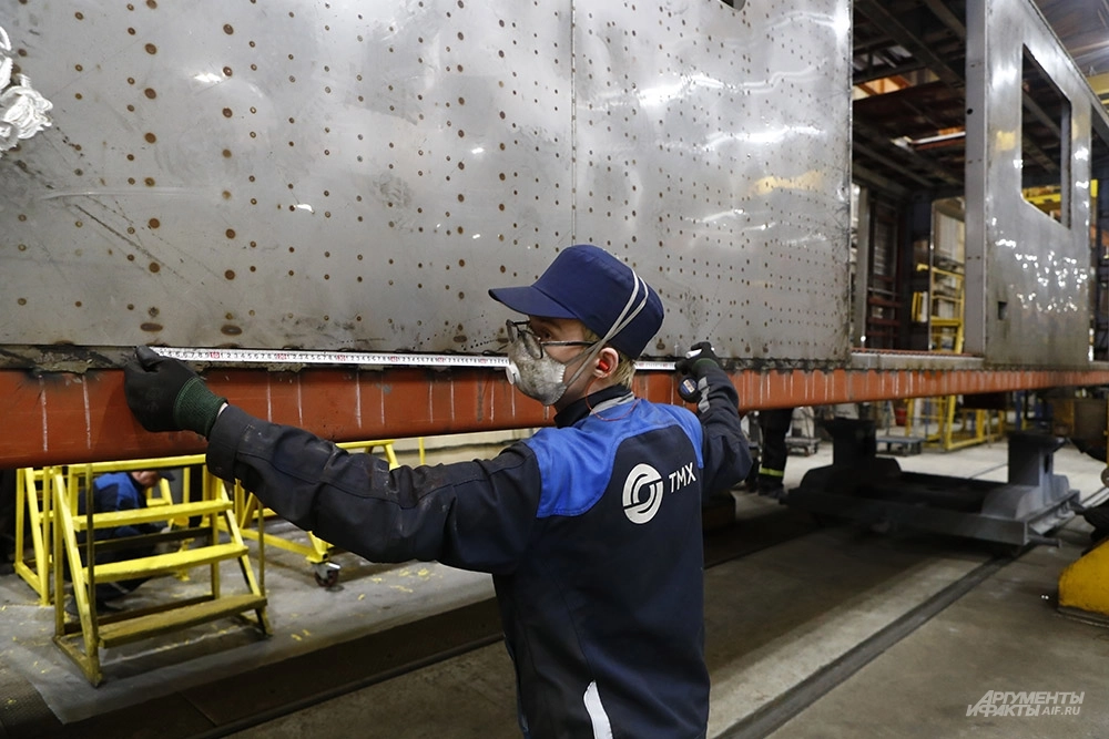 Едва переступив порог, мы замираем от впечатляющего зрелища: мостовой кран плавно несёт поражающую своими размерами и весом металлическую конструкцию. Это рама кузова, объясняет Андрей Степнов. Её перемещают к месту финишной сборки, где к основанию приварят боковины и крышу вагона.