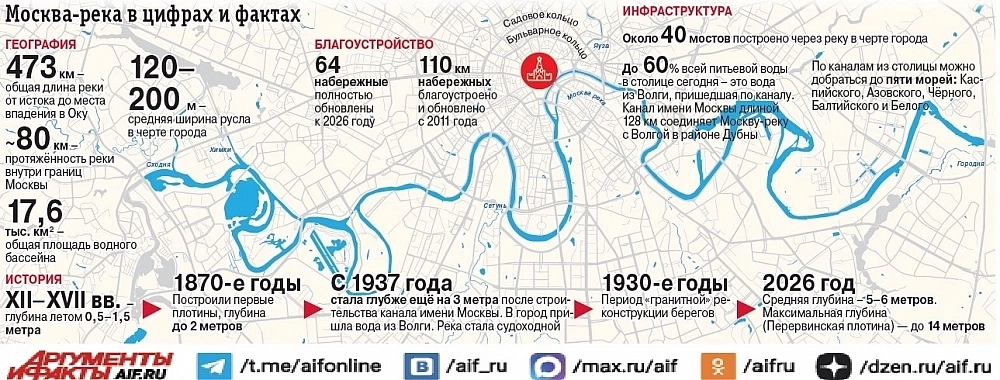 В столичных реках рыба чувствует себя не хуже, чем в других водоёмах страны, далеко за пределами мегаполиса. А всего по Москве протекает несколько десятков рек и речушек. Некоторые — с необычными названиями (на востоке, например, есть Нищенка, на севере — Таракановка, на юго-западе — Кровянка, в центре — Кабаниха). Большинство малых речек столицы забраны в подземные коллекторы. А главные реки на поверхности — Яуза, Сетунь, Городня, Сходня, Десна, Пахра и, конечно, Москва-река (см. инфографику). За ней, как и за другими водоёмами, бережно ухаживают. За санитарным состоянием следит коммунальный флот, в составе которого 30 спецсудов. Коммунальщики очищают воду от мусора и поверхностных загрязнений, удаляют песчаные наносы и ил. А дно — зона ответственности водолазов.