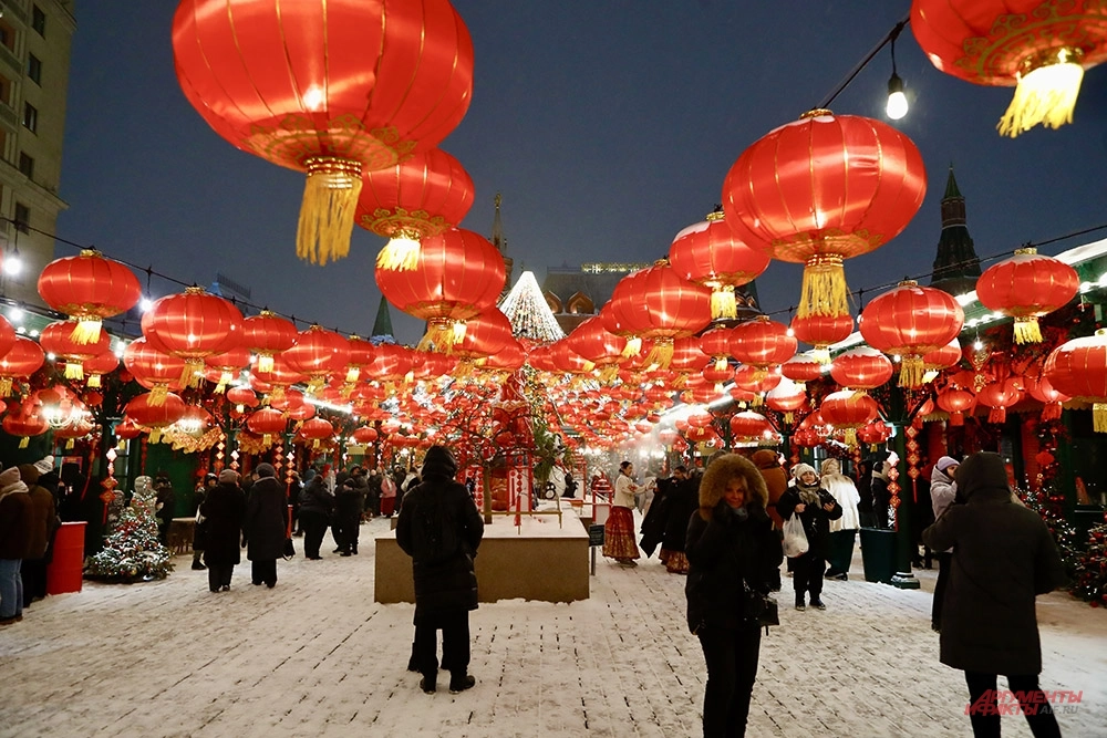 Часть Манежной площади превратилась в настоящую аллею чудес, вытянувшуюся длинным пестрым прямоугольником. По бокам её обрамляют густые ели — они здесь не просто для красоты, а выполняют роль своеобразного волшебного забора, отделяющего обыденный мир городской суеты от праздничной китайской сказки.