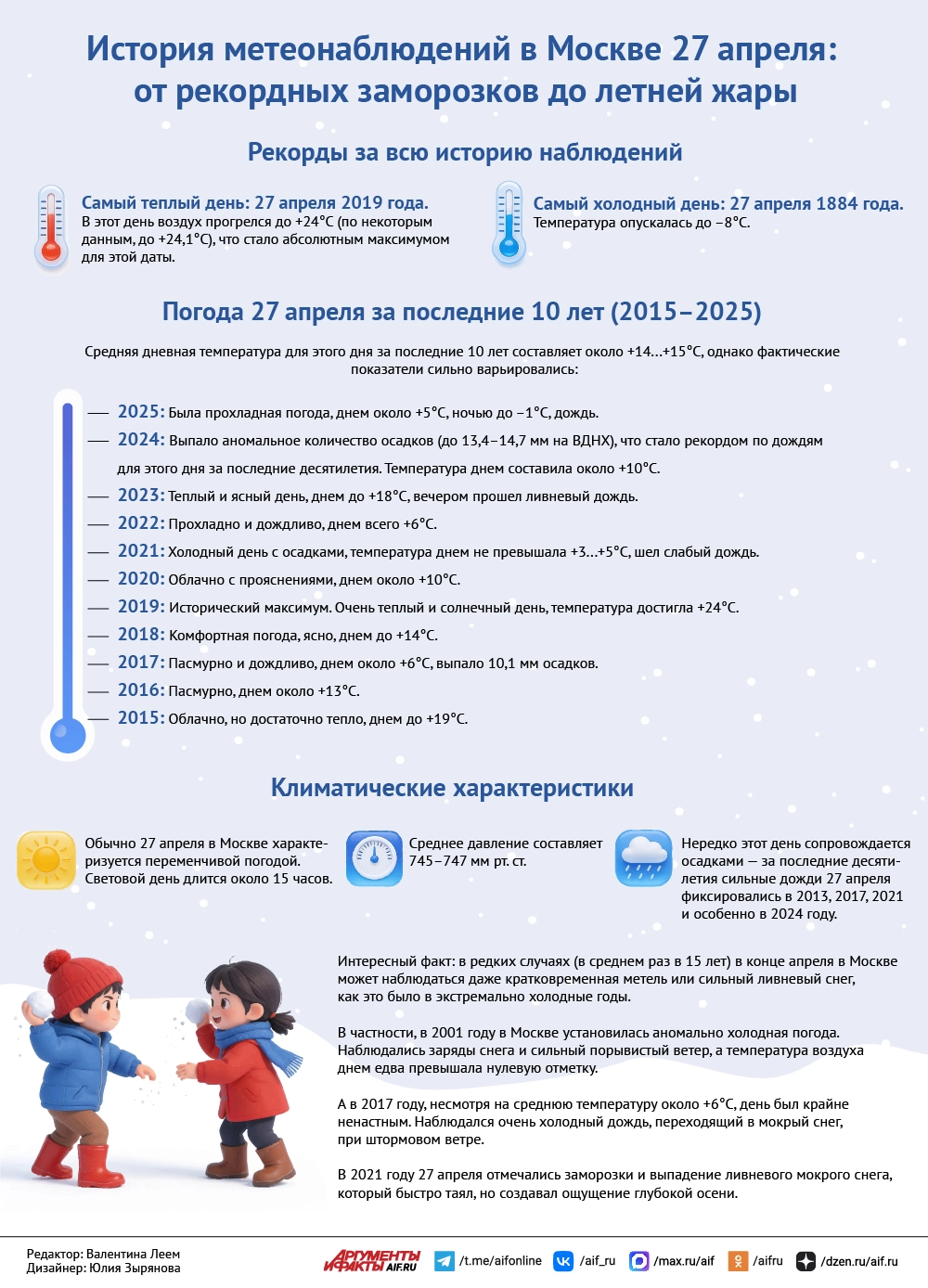 Обновлено в 14:00. Погода в Москве 27 апреля в разные годы отличалась значительным разнообразием: от почти летнего тепла до метелей и рекордных ливней. 142 года назад, кстати, погода была значительно менее комфортной — сильно ниже нуля. Ниже приведены подробные данные на основе метеорологических архивов.