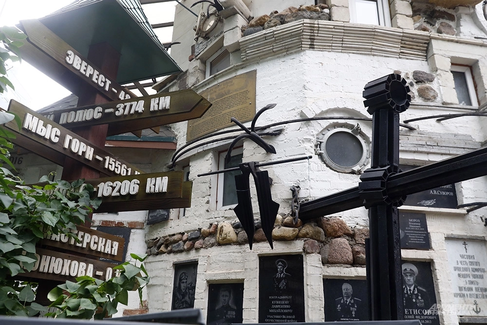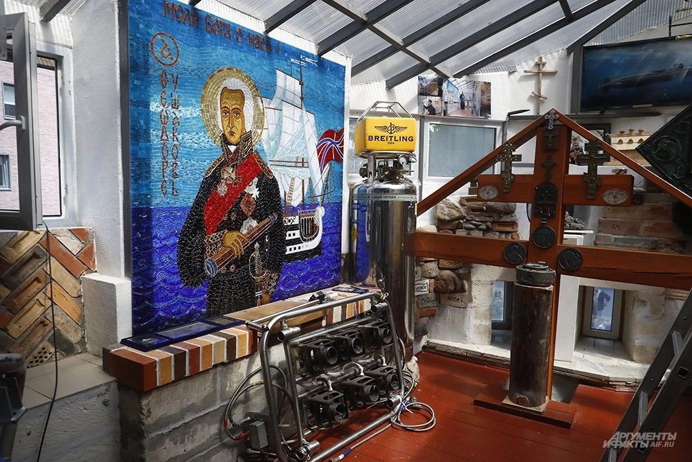 Оформлен дом-музей в морском стиле, потому всюду здесь якоря, штурвалы, и даже настоящий фрагмент борта крейсера «Варяг».