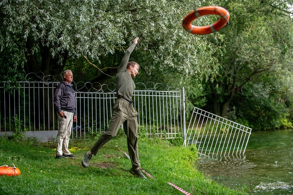 На этапе «Оказание первой помощи тонущему» спасатели бросали спасательный круг и конец Александрова, а также ныряли за манекеном — один заплыв на 100 м без снаряжения, второй — в водолазном костюме на 50 м.