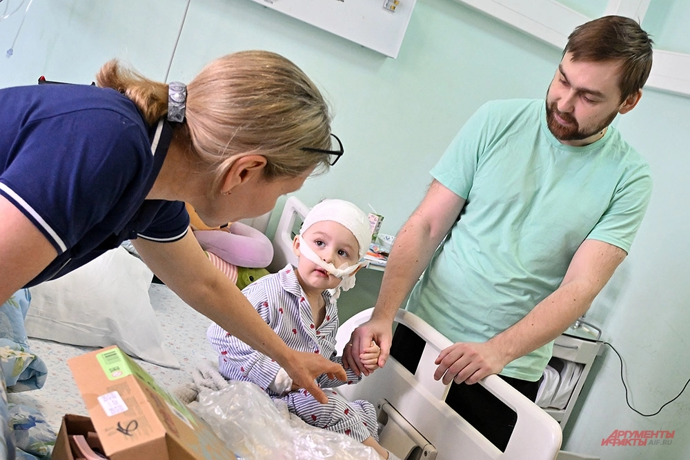 «Дочка была в очень тяжелом состоянии, поэтому ее перевели в Москву. Здесь врачи сотворили чудо — девочка пришла в сознание, чувствует себя хорошо. Сейчас ждем следующей операции: будет пластика дефекта черепа», — рассказывает отец маленькой пациентки.