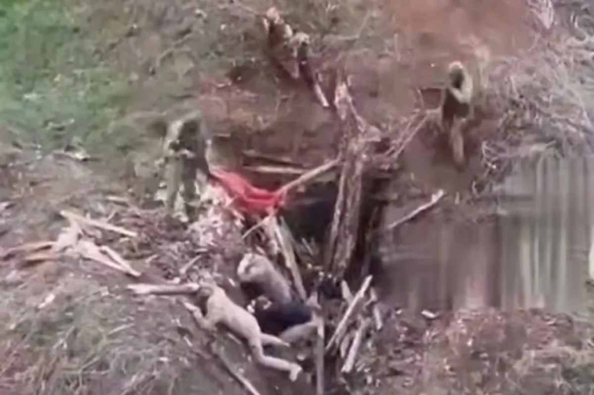 На снятом с дрона видео двое российских бойцов подобрались у укрытию боевиков ВСУ и забросали вход в него гранатами, после чего трое находившихся в блиндаже военнослужащих решили сложить оружие.
