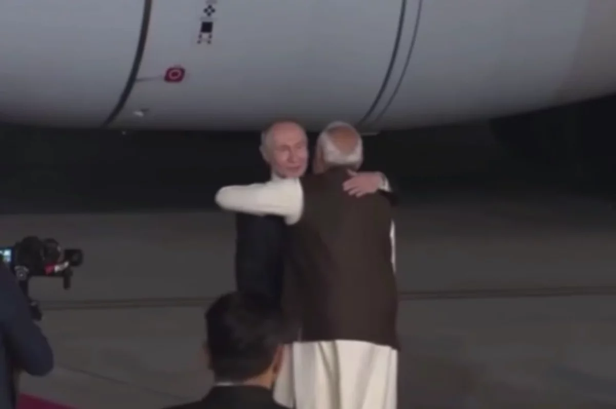 Нарендра Моди лично встретил Путина у трапа самолета на авиабазе Палам, обняв его при встрече.