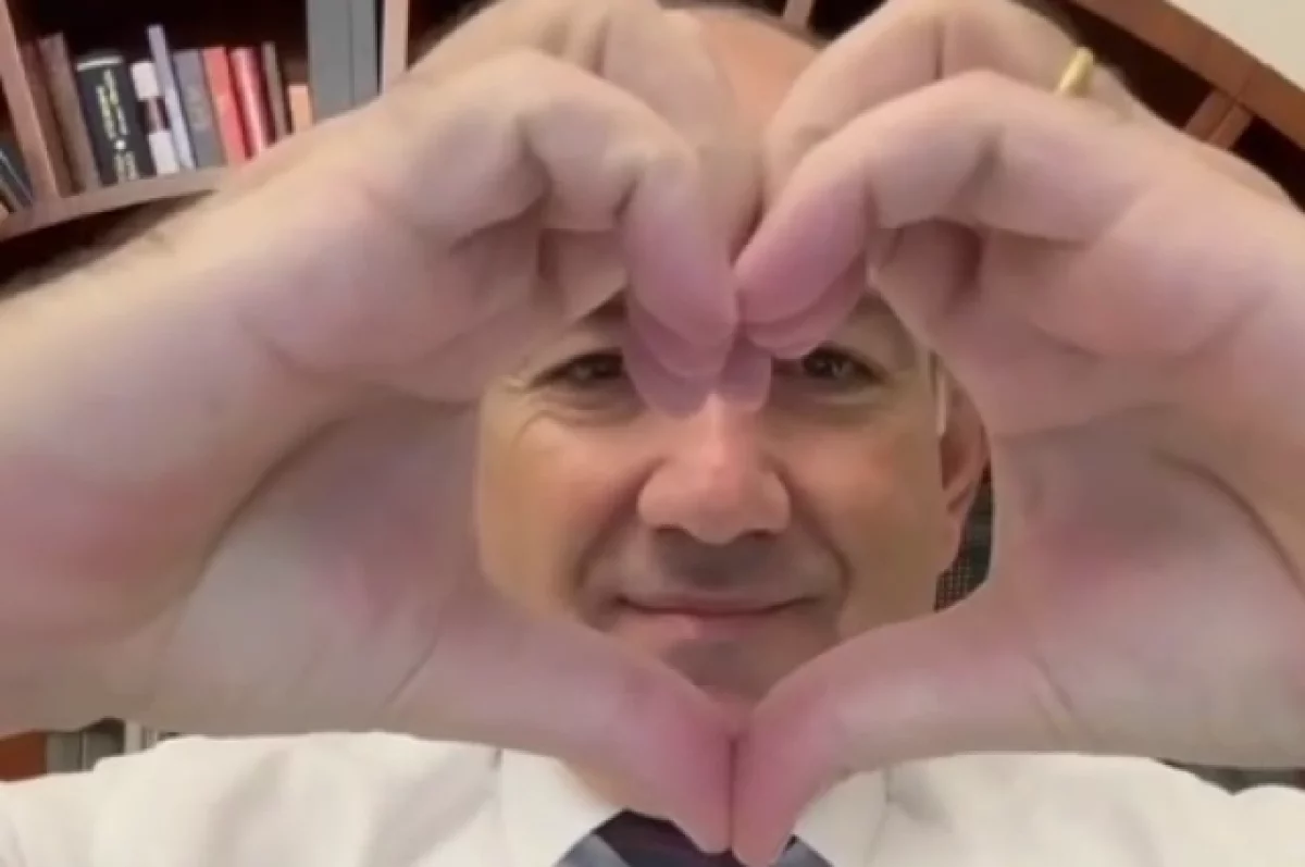 На кадрах политик в рубашке и галстуке несколько секунд неподвижно сидит, смотря в камеру, пока звучат слова: «Вновь поймем, что единственным смыслом была любовь, любовь, любовь…» Затем он делает из рук «сердечко» и смотрит в объектив уже через него, улыбаясь.