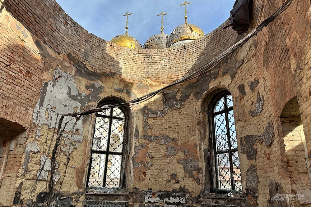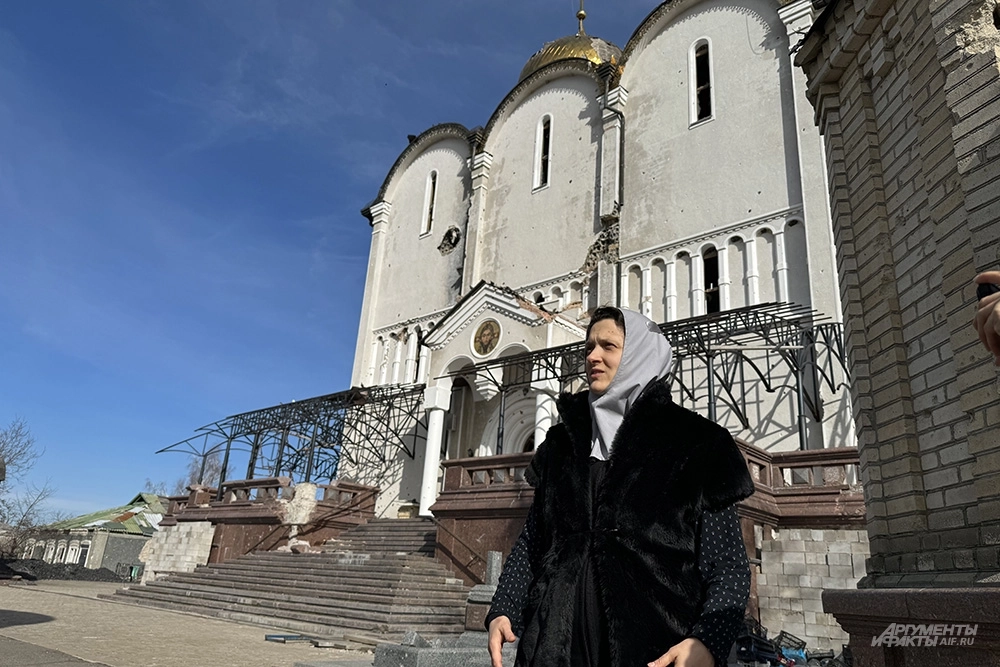 «Никольское долгое время было фактически поделено на две части. С южной стороны стояли украинские войска, а север села был за нашими ребятами. Можно даже по разрушениям на главном соборе увидеть, как нещадно по нам лупили с юга. Вот, южная сторона собора. Она пострадала больше всего. В алтарной части до сих пор ракета от „Града“ торчит», — показывает монахиня.