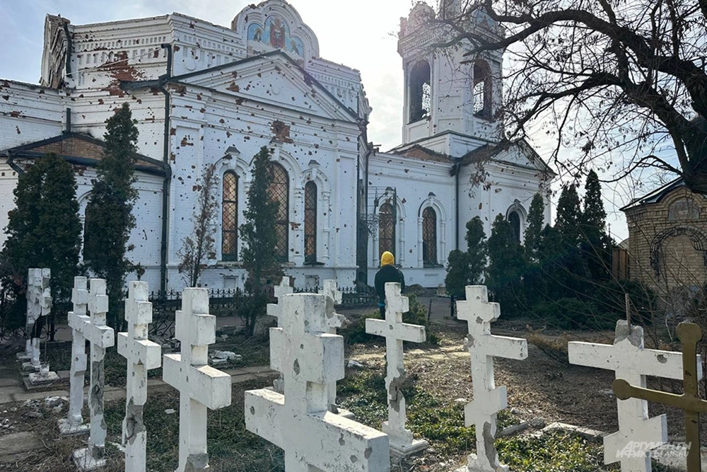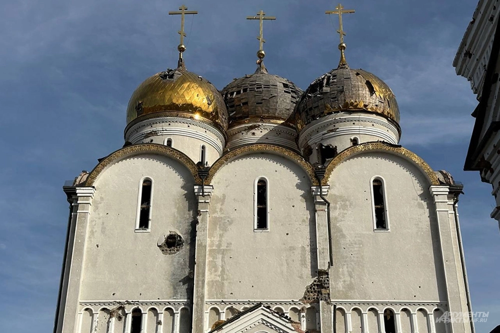 Ракета, застрявшая в белесой стене собора, выглядит уродливо и инородно даже на фоне остальных разрушений. Стены собора, словно оспой, покрыты следами от осколков. Золото куполов повреждено, а плитка на территории напоминает собой лунную поверхность — повсюду здесь следы от прилетов мин.