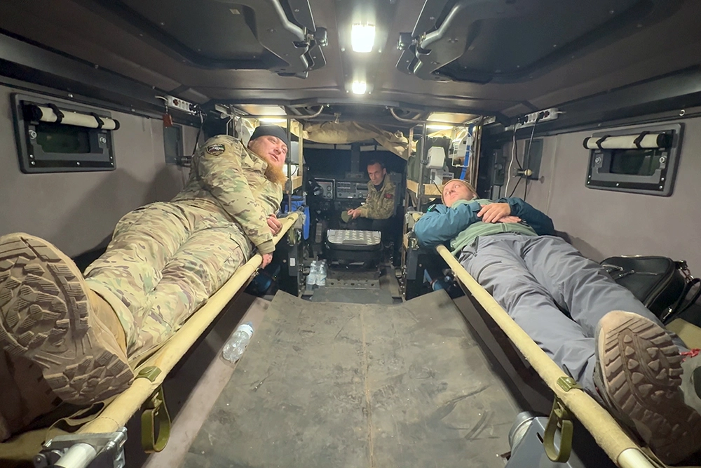 Я удобно расположился на носилках, прочно закрепленных в кузове эвакуационного автомобиля. На соседней койке начальник медицинской службы спецназа «Ахмат» с позывным Буля, а над нами несколько слоев прочной брони, на которую приварены специальные сетки против дронов-камикадзе. Слава богу, мы не ранены, а просто тестируем на себе удобство реанимобиля.