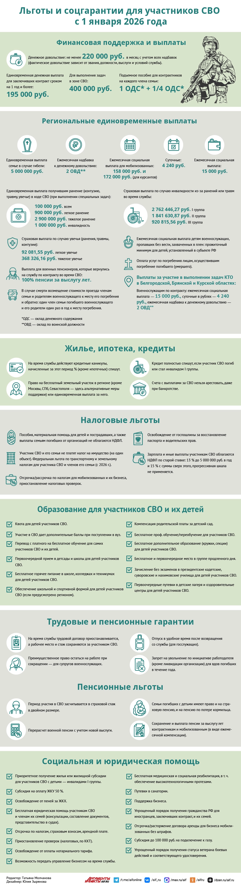 С 2022 года в России сформирован комплекс законодательных мер, направленных на всестороннюю поддержку участников СВО, а также их близких. Aif.ru собрал все ключевые меры поддержки, действующие по состоянию на 1 января 2026 года, в одну понятную инфографику. От финансовой помощи при тяжелых ранениях до гарантий при поступлении в вуз — эта памятка поможет быстро найти информацию по нужному вопросу.