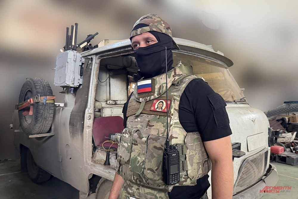 На «УАЗе» предусмотрительно спилена крыша. Вместо задних сидений стоит пулеметная турель. Тут же торчат причудливые антенны системы РЭБ. С собой еще и небольшой мобильный чемоданчик РЭБ, на случай если придется спешиваться и укрываться от вражеских дронов, а такое бывает нередко.