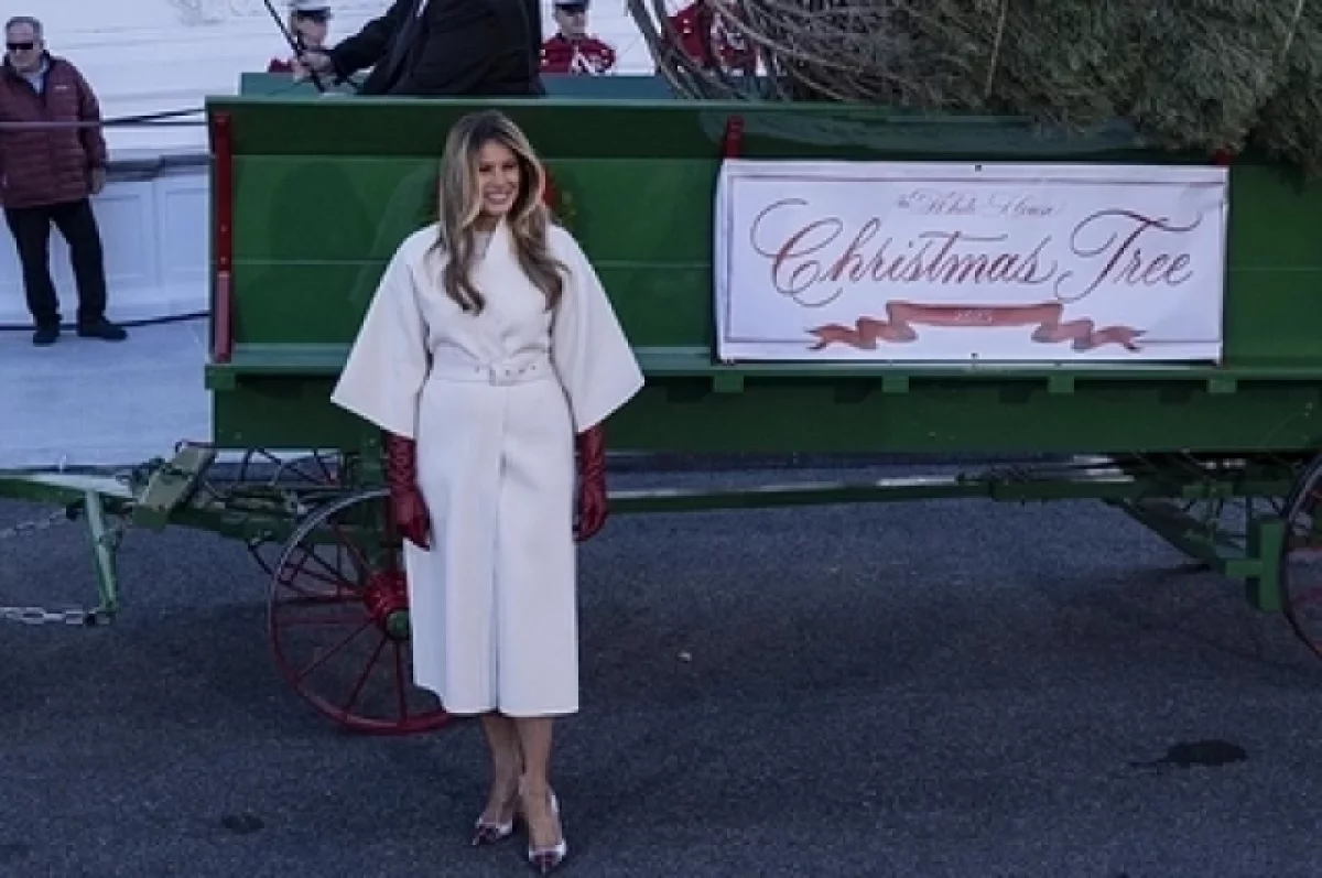 Отмечается, что 55-летняя фотомодель и дизайнер присутствовала при доставке рождественской ели в штаб-квартиру президента США. Она появилась перед камерами в белом пальто Dior с укороченными рукавами и поясом. Образ дополнили красные кожаные перчатки и клетчатые туфли на шпильках бренда Manolo Blahnik.
