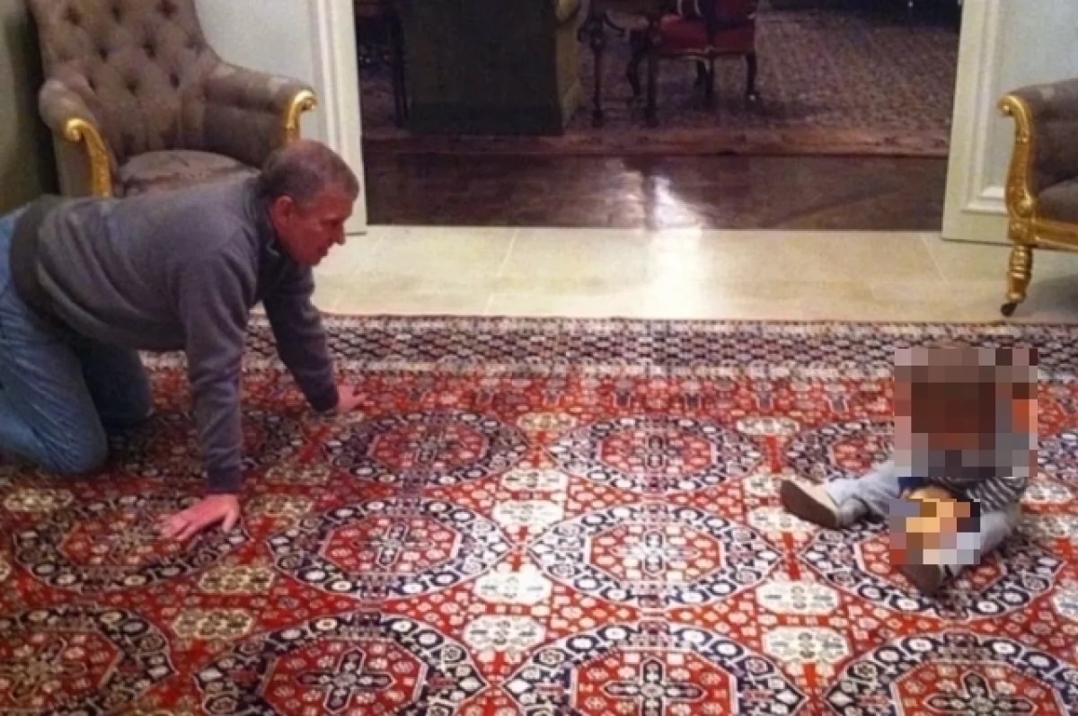 На первом снимке – экс-принц стоит на четвереньках на ковре, напротив него – ребенок с мячом в руках. На второй фотографии – Эндрю сидит с мальчиком на диване.