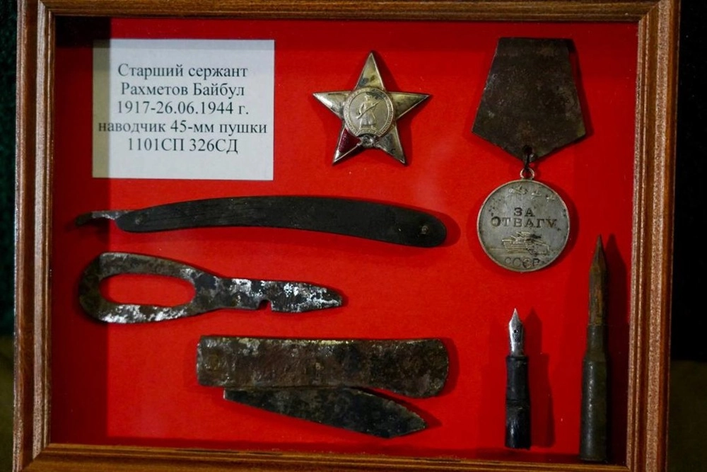 Рахметова и Калмурзаева удалось идентифицировать по индивидуальным номерам найденных при них наград. Орден Красной звезды и медали «За отвагу», потёртые временем, тускло поблёскивали в траурном зале. Также рядом с останками солдат — некоторые их личные вещи, обнаруженные в братской могиле: кружка с надписью «СССР» и значком Красного Креста, ножик-складенец, бритва, монеты.