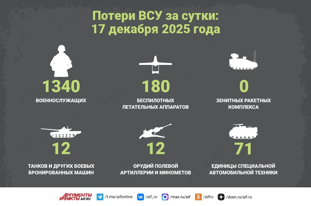 По данным Минобороны РФ, за 17 декабря Вооруженные силы Украины (ВСУ) потеряли убитыми и ранеными 1340 человек. Кроме того, наши военные уничтожили 180 беспилотников противника.