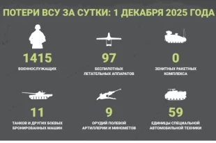 Минобороны РФ опубликовало данные о потерях ВСУ за 1 декабря. Противник не досчитался 1415 военнослужащих.