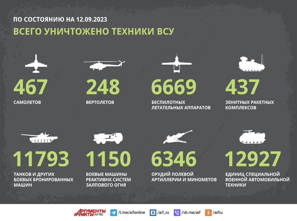 По подсчетам Минобороны России, с начала СВО уничтожено: 467 самолетов, 248 вертолетов, 6669 беспилотников, 437 ЗРК, 11793 танка и других бронированных машин, 1150 РСЗО, 6346 артиллерийских орудий и минометов, 12927 единиц спецтехники врага.