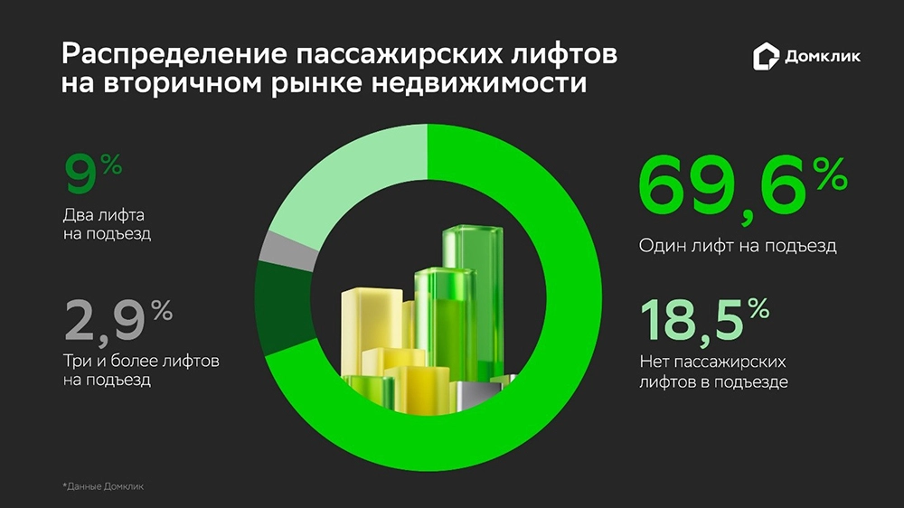 Стандартом для российского рынка вторичной недвижимости является наличие одного пассажирского лифта на подъезд — на такие объекты приходится почти 70% всех актуальных объявлений. Почти каждая пятая квартира (18,5%) расположена в доме, где пассажирские лифты отсутствуют вовсе. Более комфортные варианты с двумя подъемниками встречаются в 9% случаев, а доступ к трем и более лифтам имеют лишь 2,9% квартир.