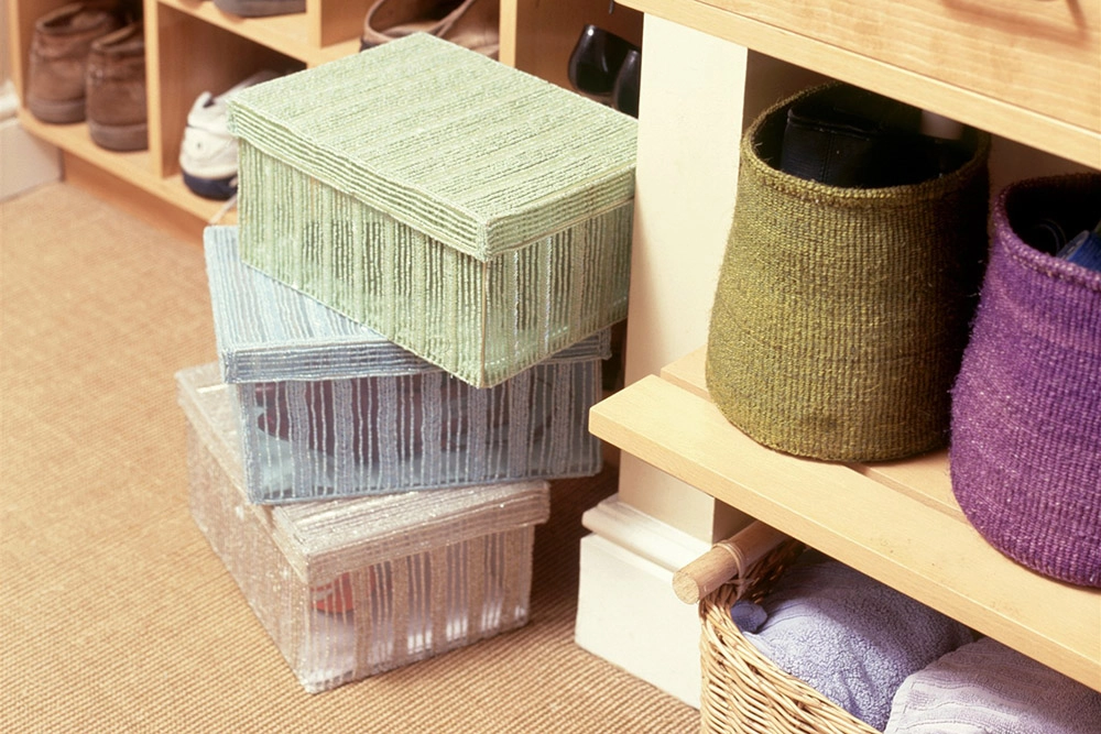 Для трикотажа и деликатных тканей подойдут тканевые мешки или коробки с крышками. Они обеспечивают вентиляцию и предотвращают появление неприятного запаха. Обувь лучше хранить в индивидуальных коробках с саше из силикагеля для защиты от влаги.