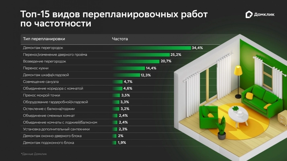 Вполне ожидаемо самыми часто реализуемыми работами по перепланировкам квартир стали изменения существующих перегородок. Демонтаж этих конструкций встречается в 34,4 % случаев, а возведение новых — в 20,7 %. При этом большинство таких изменений допустимы при условии оформления и если не затрагиваются несущие конструкции. Часто изменения связаны с дверными проёмами внутри квартиры — перенос или изменение встречается в 25,2 % перепланировок, где на полную закладку приходится 6,3 %.
