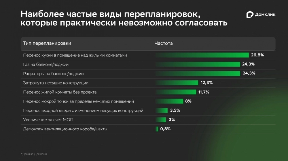 Хотя большинство (93,7 %) переустройств, выявленных за последний год, могут быть узаконены, 6,3 % нельзя легализовать. Существенная часть — это перенос на балкон или лоджию газового оборудования или радиаторов отопления. На них приходится 48,6 % случаев от общего числа неподлежащих легализации реконструкций. Перенос кухни в жилую комнату возможен только при соблюдении ряда условий.