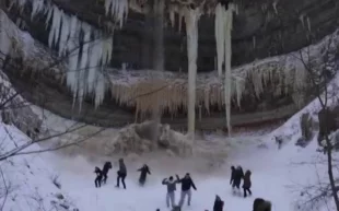 В Сети появились кадры, на которых на туристов падают ледяные глыбы с водопада Валасте в Эстонии.