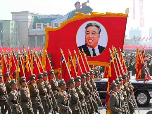 Ким Чен Ын появился на трибуне в 10:00 под аплодисменты и салют. Он принимал парад под портретами отца и деда — бывших руководителей республики.