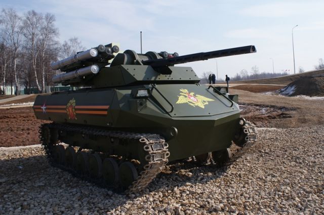 «Уран-9» - радиоуправляемый робототехнический комплекс разведки и огневой поддержки. Оснащен пулеметом ПКТМ, огнеметами «Шмель-М» и автоматической 30-миллиметровой пушкой 2A72.